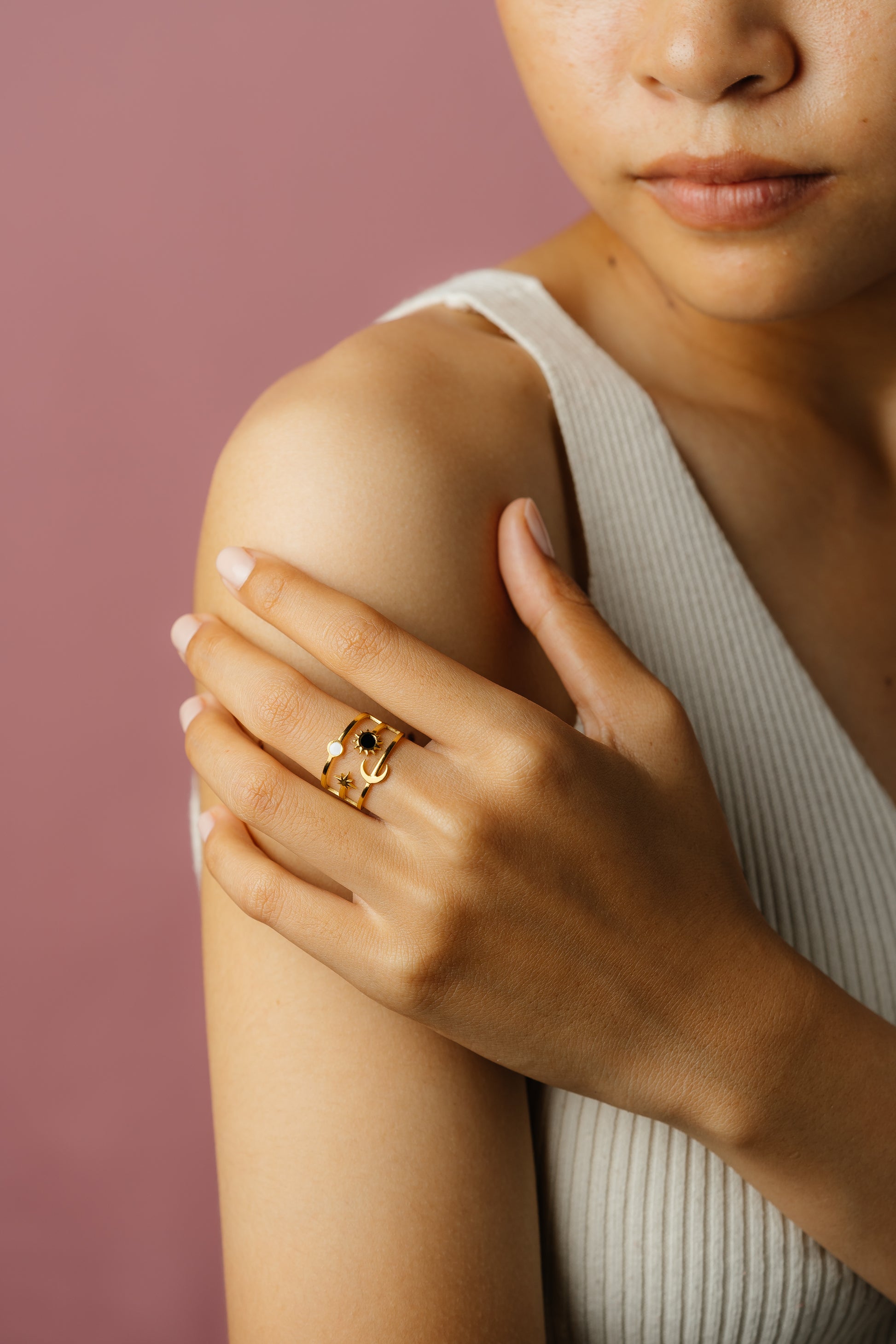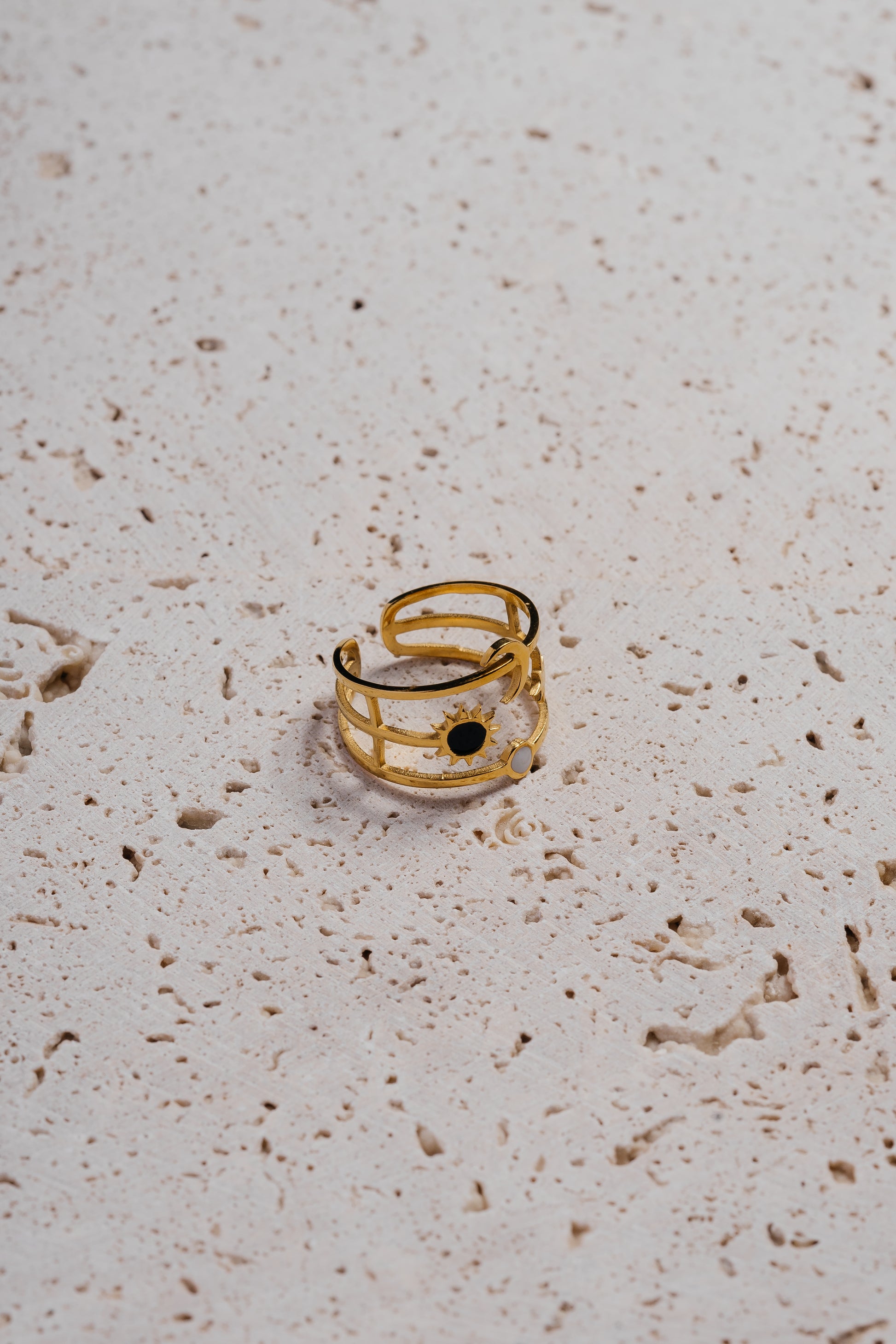 A cosmic blend of sun, moon, and stardust — this celestial-inspired ring brings a little light to every hand. With radiant gold curves and symbolic detail, it’s made for star-chasers and moon-watchers alike.