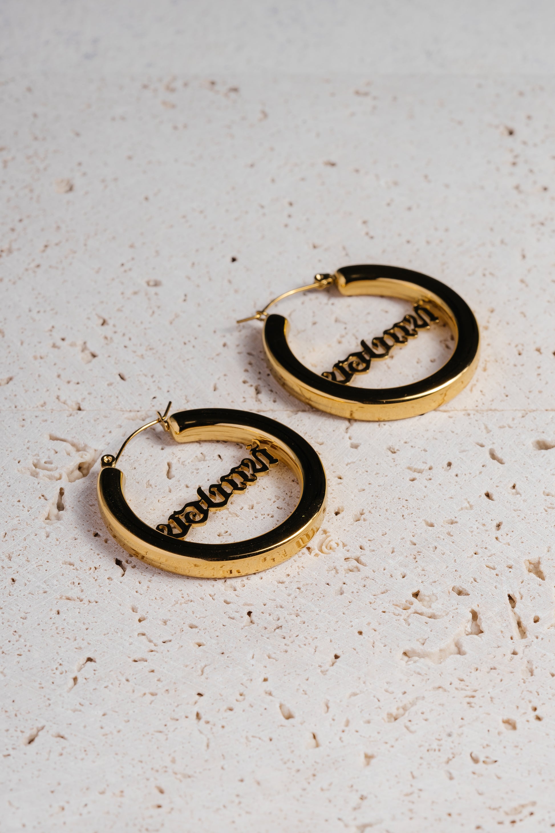 Make a bold statement with these Genuine Hoop Earrings, featuring the Thai word for "Genuine" suspended elegantly within classic gold hoops. Designed as a symbol of authenticity and self-expression, these earrings blend traditional script with contemporary style—perfect for those who embrace their truth.