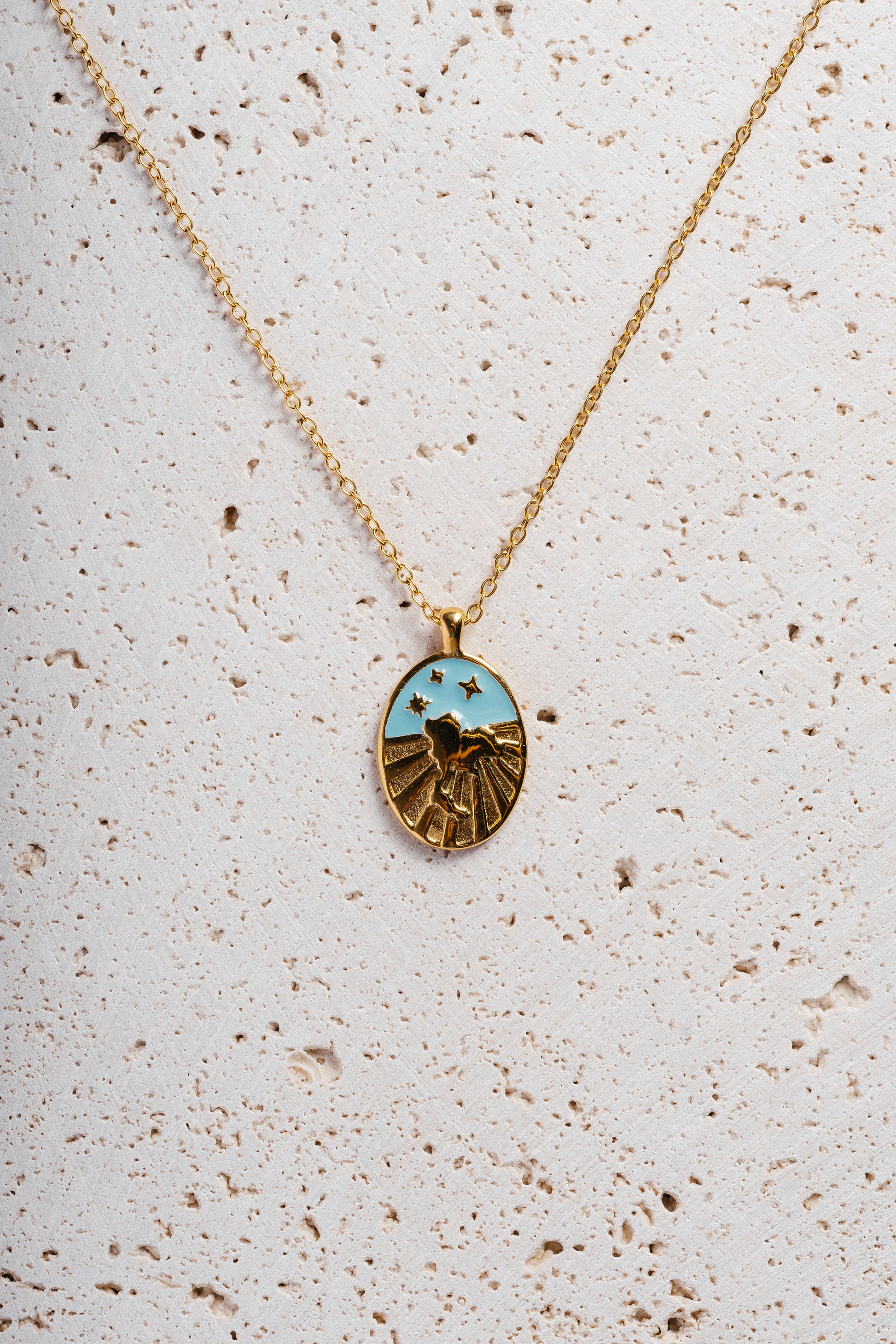 Gold pendant featuring a map of Thailand beneath a bright blue sky with radiant sun rays. Paired with a long, elegant waterwave gold chain for a timeless look.