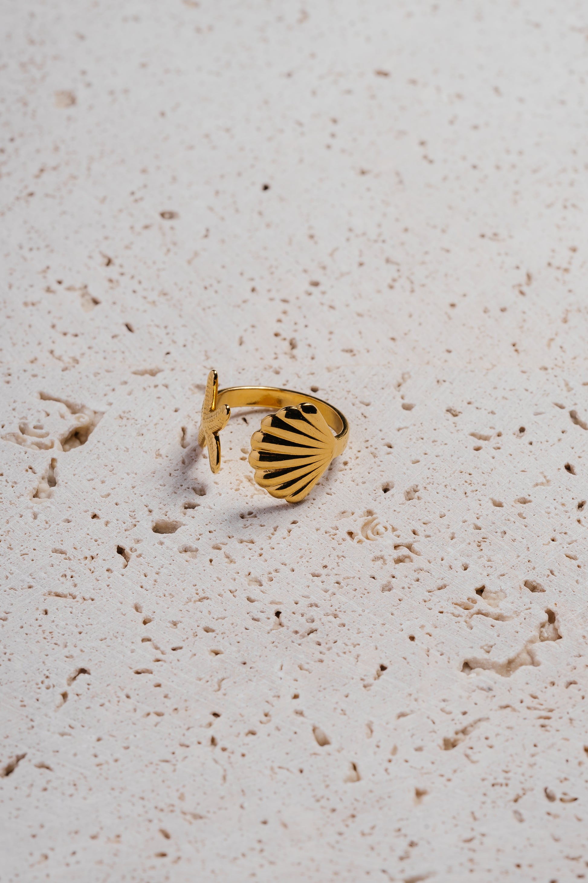 A tribute to ocean lovers, this adjustable open ring features a beautifully detailed starfish and seashell, capturing the essence of the sea and shore. The textured starfish adds a touch of sparkle, while the polished shell brings a sense of calm elegance, making this piece perfect for beach days and beyond.