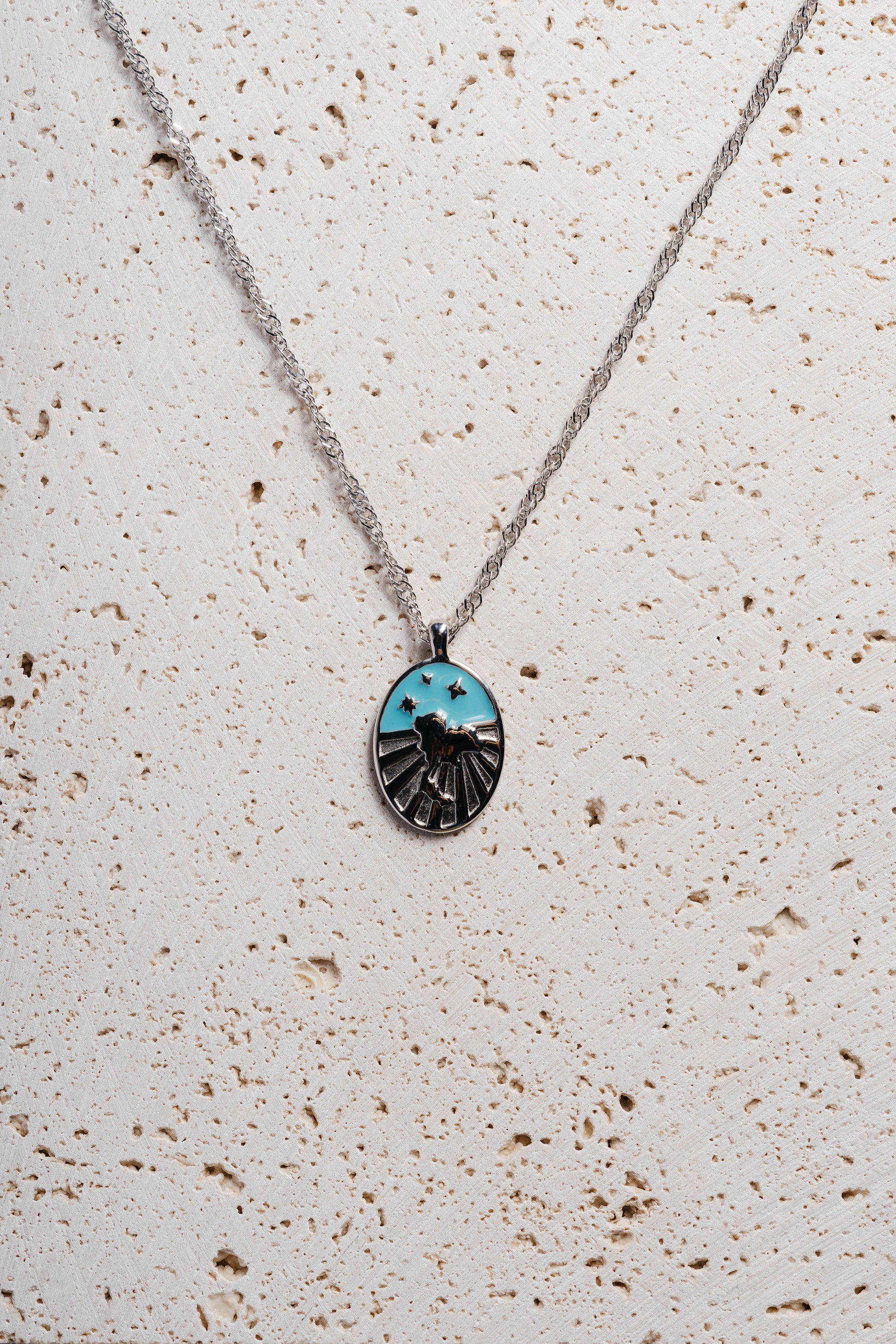 Silver pendant featuring a map of Thailand beneath a bright blue sky with radiant sun rays. Paired with a long, elegant waterwave silver chain for a timeless look.